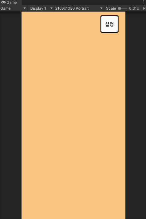 예를 들어 음량을 조절하는 설정 버튼을 우측 상단에 위치시키고 싶은 상황이 있습니다. 이런 경우 Constant Pixel Size가 아닌 Scale With Screen Size 옵션을 사용하는 것이 좋습니다. 이 경우 UI는 Reference Resolution에서 정한 값을 기준으로 실제 화면 해상도에 따라서 확대 또는 축소됩니다. 화면 종횡비가 맞지 않을 경우에 어떻게 대응할지 Screen Match Mode에서 설정할 수 있습니다. 즉, 개발자는 고정된 레퍼런스 해상도를 기준으로 UI 작업을 진행하게 되며, 해상도 변화에 따라서 실제 화면이 어떻게 달라지는지 Game 화면에서 확인하면 됩니다.