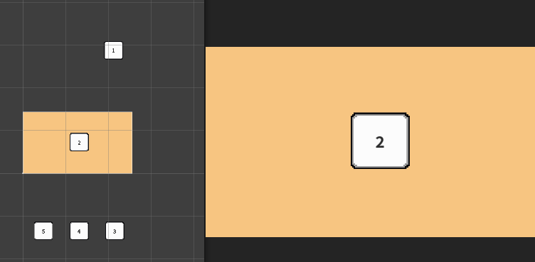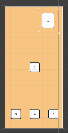 아쉽지만 이것이 모든 UI 해상도 대응을 "마법"처럼 해주는 것은 아닙니다. 실제로 UI 작업을 5분만 해보면 "마법"이라는 것이 일어나지 않는다는 것을 알 수 있습니다. 아래와 같이 2960x1440 Portrait에서 1번 버튼은 "적당히" 오른쪽 위에, 2번 버튼은 정중앙에, 나머지는 "적당히" 아래쪽에 고르게 분포하는 UI 기획이 있다고 가정해봅시다. Scale With Screen Size 옵션만으로는 버튼이 화면 밖으로 나가는 현상이 발생할 것입니다. 이제 가로 모드를 지원하는 기획이 나왔다고 상상해보고 아래와 같이 화면을 가로로 바꾸어 보았습니다. 끔찍하네요.