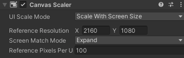 유니티에서 UI는 반드시 Canvas의 자식이어야 합니다. 따라서 모든 UI는 Canvas 안에 있게 됩니다. 유니티에서 어떤 UI를 만들든지 Canvas 게임 오브젝트는 자동으로 부모로 생성됩니다. 따로 Canvas만 생성할 수도 있습니다. 이때 Canvas에 Canvas Scaler 컴포넌트가 자동으로 생성되는데 이 컴포넌트는 해당 Canvas 안에 있는 모든 UI 요소의 전체적인 크기와 픽셀 밀도를 제어합니다. 기본값으로 UI Scale Mode는 Constant Pixel Size가 되어 있습니다. 필요에 따라서 고정된 픽셀값으로 무언가를 보여 주어야 할 경우 해당 옵션을 사용할 수도 있을 것입니다. 하지만 모바일 환경에서는 화면 크기와 관계없이 UI의 위치를 특정 위치에 고정하고 싶은 상황이 많습니다.