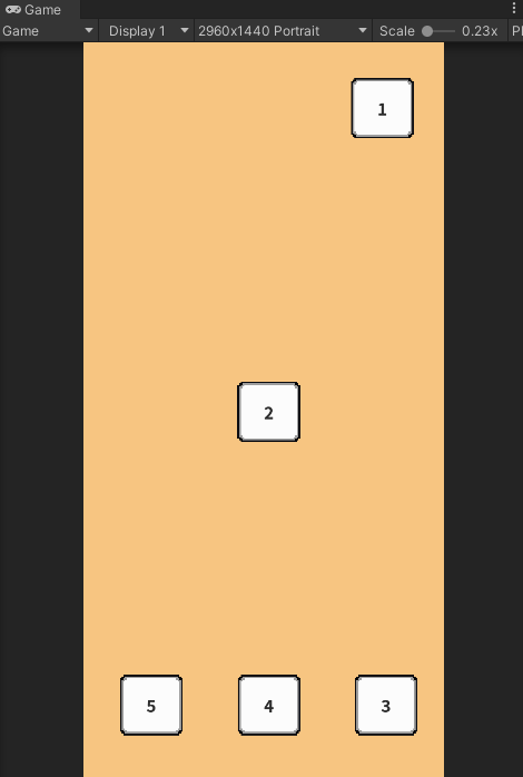 아쉽지만 이것이 모든 UI 해상도 대응을 "마법"처럼 해주는 것은 아닙니다. 실제로 UI 작업을 5분만 해보면 "마법"이라는 것이 일어나지 않는다는 것을 알 수 있습니다. 아래와 같이 2960x1440 Portrait에서 1번 버튼은 "적당히" 오른쪽 위에, 2번 버튼은 정중앙에, 나머지는 "적당히" 아래쪽에 고르게 분포하는 UI 기획이 있다고 가정해봅시다. Scale With Screen Size 옵션만으로는 버튼이 화면 밖으로 나가는 현상이 발생할 것입니다. 이제 가로 모드를 지원하는 기획이 나왔다고 상상해보고 아래와 같이 화면을 가로로 바꾸어 보았습니다. 끔찍하네요.