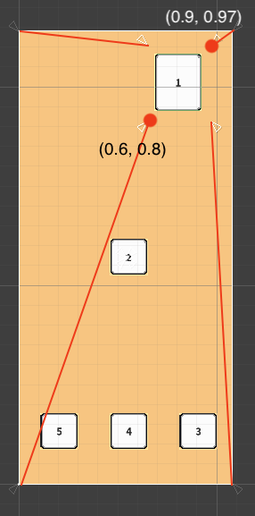 앵커는 부모 사각형의 가로 길이와 세로 길이에 대한 비율로부터 정의되는 좌표입니다. 예를 들어 4개의 작은 흰 삼각형 중 (0.6, 0.8) 앵커는 좌측하단 모서리를 기준(0, 0)으로 하여 부모 가로 길이의 60%, 부모 세로 길이의 80%에 위치한다는 뜻입니다. 그리고 앵커들로 만들어진 사각형으로부터 떨어진 거리 정보 Left, Top, Right, Bottom로부터 실제 사각형의 크기가 결정되게 됩니다.
