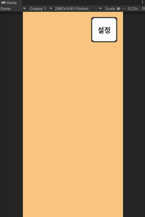 예를 들어 음량을 조절하는 설정 버튼을 우측 상단에 위치시키고 싶은 상황이 있습니다. 이런 경우 Constant Pixel Size가 아닌 Scale With Screen Size 옵션을 사용하는 것이 좋습니다. 이 경우 UI는 Reference Resolution에서 정한 값을 기준으로 실제 화면 해상도에 따라서 확대 또는 축소됩니다. 화면 종횡비가 맞지 않을 경우에 어떻게 대응할지 Screen Match Mode에서 설정할 수 있습니다. 즉, 개발자는 고정된 레퍼런스 해상도를 기준으로 UI 작업을 진행하게 되며, 해상도 변화에 따라서 실제 화면이 어떻게 달라지는지 Game 화면에서 확인하면 됩니다.