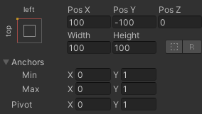 그렇다면 우리는 아래와 같이 직관적으로 왼쪽 위 모서리에 있는 프리셋을 이용하면 됩니다. Anchor, pivot, position을 모두 left-top으로 설정하게 되면 크기를 고정(Width, Height)한 상태에서 좌표(PosX, PosY)만 설정하면 됩니다. 현재 게임 오브젝트(흰색 버튼)의 pivot을 왼쪽 위 모서리로 설정되어 있으므로 떨어져야 할 거리를 좌표 (100, -100)으로 두면 UI 기획대로 UI가 쉽게 완성됩니다.