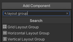 위 사진에서 아이콘뿐만 아니라 Grid, Horizontal, Vertical 이라는 영어 이름부터 직관적입니다. 이 컴포넌트를 부모에게 주면 가로, 세로 배치 혹은 격자 배치에 따라서 자식 오브젝트들이 배열됩니다. Buttons Panel에 4개의 흰 버튼이 있는 상황이라고 가정하겠습니다. Grid Layout Group을 예시로 들어보자면 내부에 각 UI의 크기(Cell Size), 자식 오브젝트들 사이 간격(Spacing), 자식 오브젝트들 정렬 방식(Child Alignment) 등을 변경하여 원하는 다수의 UI를 배치할 수 있습니다.