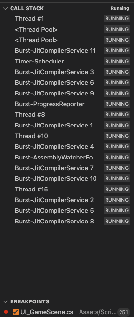 - 호출 스택이 채워지는 것을 확인합니다. 호출 스택이 채워지지 않는다면 VScode나 유니티 혹은 둘 다 종료하여 재시작합니다.