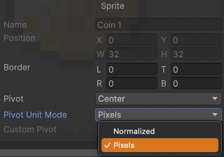 - Sprite Editor에 들어가서 Pivot Unit Mode도 Pixels로 바꾸어 아래 사진처럼 pivot의 좌표가 픽셀 단위로 설정되게 만들어줍니다.