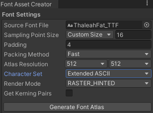 - Rendering Mode : RASTER_HINTED는 픽셀 폰트를 위해 필수적입니다. (ttf파일과 font asset creator에 둘 다 설정해줍니다.)