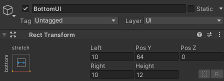 TopUI의 경우 요구되는 기획이 붉은색 푸른색 상자 모두 좌우로부터 10px씩 떨어지고(Canvas Scaler 기준) 위에서 10px이 떨어지는 것이라고 가정하겠습니다. 비슷하게 BottomUI의 경우 좌우로부터 10px씩 떨어지고 아래에서 64px이 떨어져야 합니다. 이 여유 간격은 사용자의 화면 비율과 관계없이 유지하기로 했으므로 부모인 캔버스의 가로 길이(스크린 가로 길이)를 유지하기 위해 stretch를 사용하는 것이 좋아 보입니다. 저는 아래와 같이 Rect Transform을 설정해주었습니다. 인스펙터에 픽셀 값을 기획에 따라 직관적으로 기입, 수정하기 위해서 Anchor Preset에서 pivot과 position도 각각 stretch top, stretch bottom으로 설정해두었습니다. Anchor Preset에 대해서는 이전 글에서 다루었으므로 넘어가겠습니다.