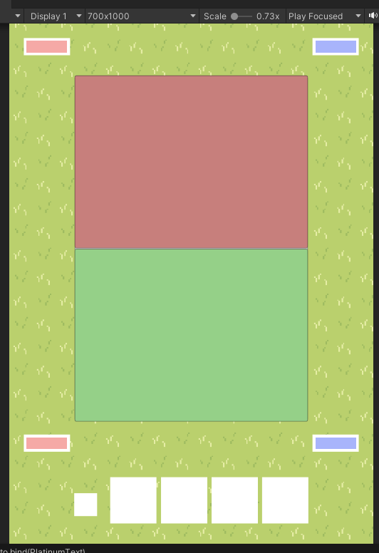 아래 사진은 클래시 로얄과 비슷한 게임 화면을 구현한다고 했을 때 해상도별 기획이라고 하겠습니다. 중앙에 고정적으로 배치된 붉은색과 초록색 큰 네모가 영역 A에 해당하는 전투 영역입니다. 가장 아래 흰색 UI가 유저가 고르는 카드입니다. 나머지 흰 테두리에 작은 빨강 파랑 네모는 각각 UI입니다.